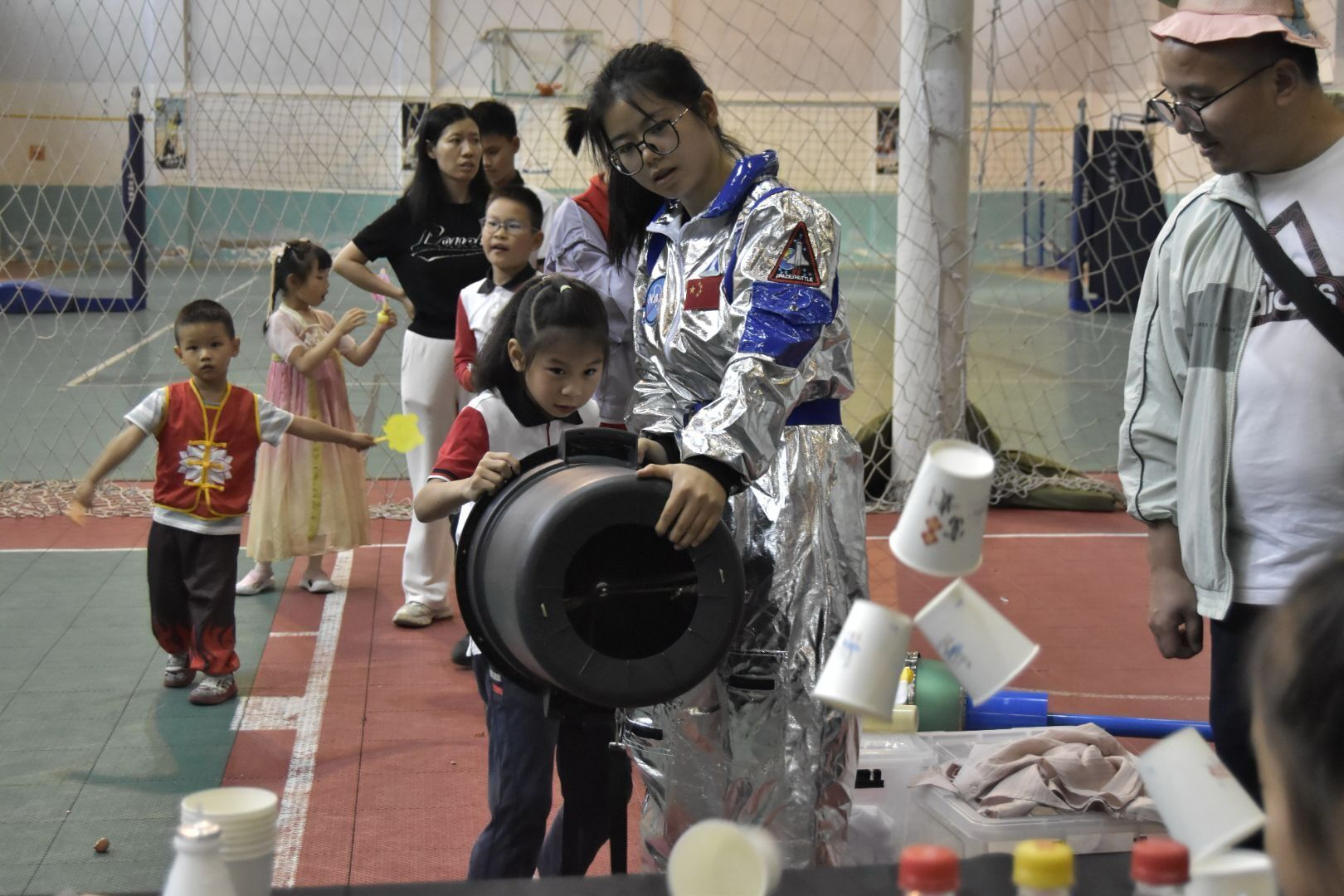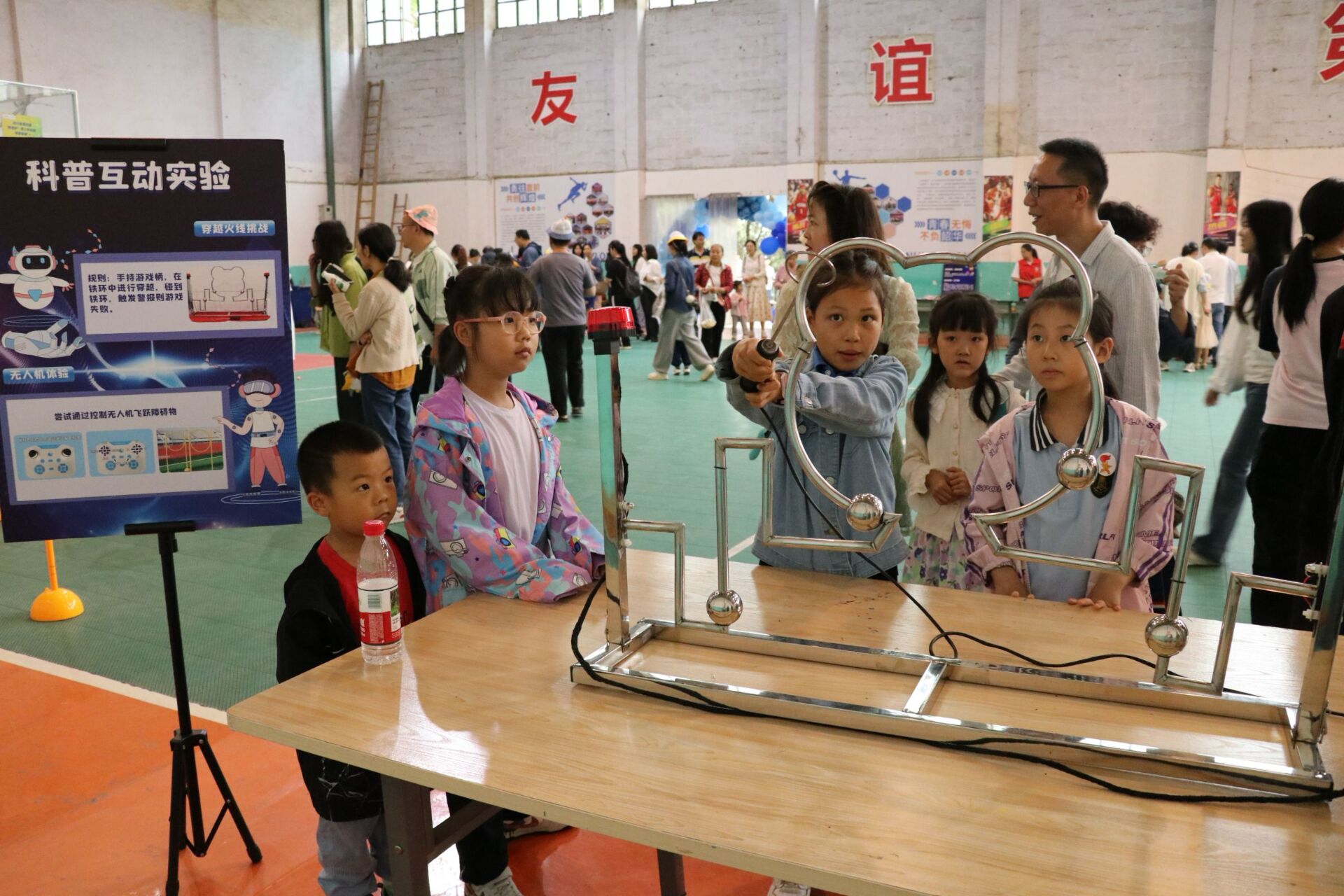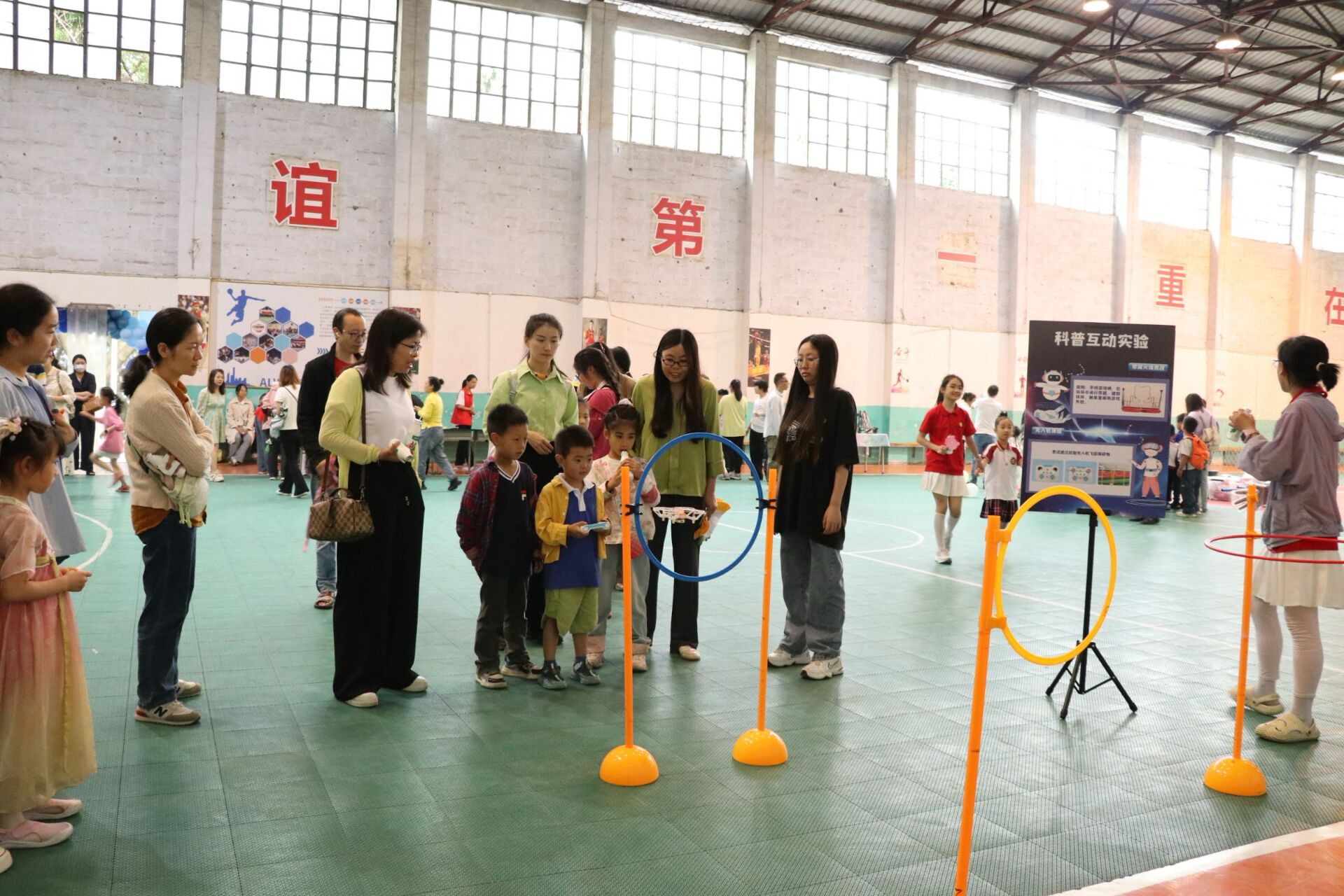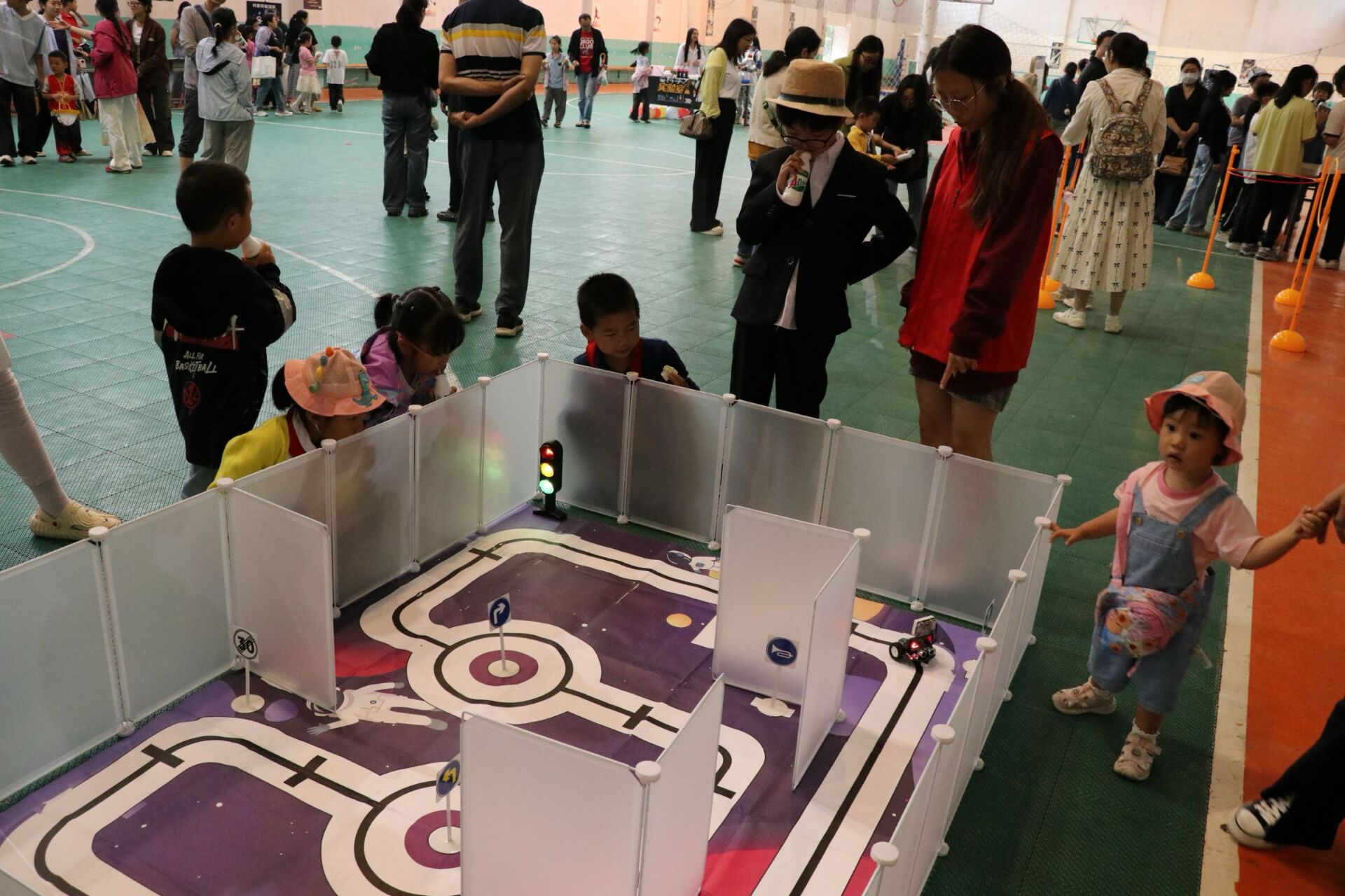 文艺汇演结束后,孩子们在志愿者带领下进入科技游园环节。现场设有机器人、物理实验等互动展区,孩子们或组装模型,或操作实验设备,在动手实践中感受科技魅力。家长与孩子协作完成挑战任务,现场互动频繁,欢笑声此起彼伏,营造出浓厚的科普氛围。