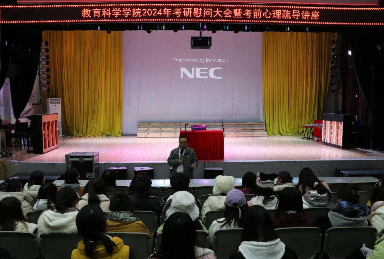 为缓解考研学子备考压力,激励其坚定信心、克服万难、勇往直前,2024年11月28日下午,教育科学学院在演奏厅举办考研慰问大会暨考前心理疏导讲座”。应用心理学专业负责人王洲林担任主讲嘉宾,全院考研学生100余人参会,学办负责人杨柳主持。