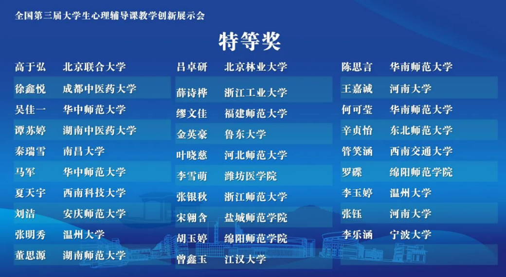 近日,由教育部高等学校心理学类专业教学指导委员会、中国心理学会主办,浙江师范大学、华东师范大学、浙江省桐乡市教育局承办的全国第三届大学生心理辅导课教学创新展示会决赛在浙江省桐乡市上海尚阳外国语学校桐乡实验学校顺利举行。我校教育科学学院应用心理学专业胡玉婷、罗碟两位同学在专任教师吕林的指导下,双双荣获全国特等奖。