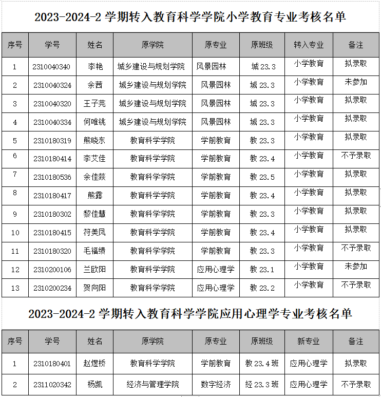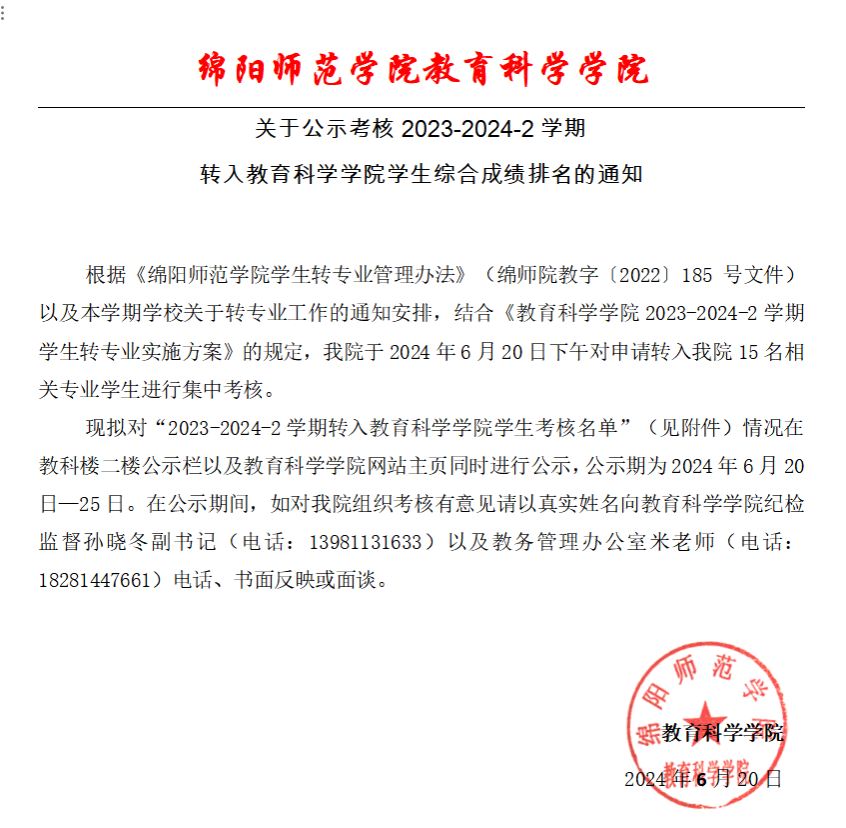 关于公示考核2023-2024-2学期转入教育科学学院学生综合成绩排名的通知