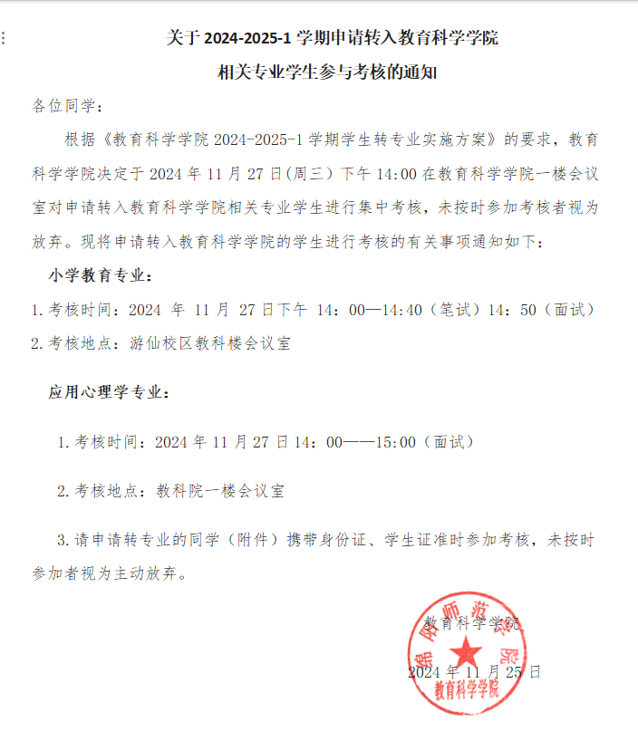 关于2024-2025-1学期申请转入教育科学学院 相关专业学生参与考核的通知